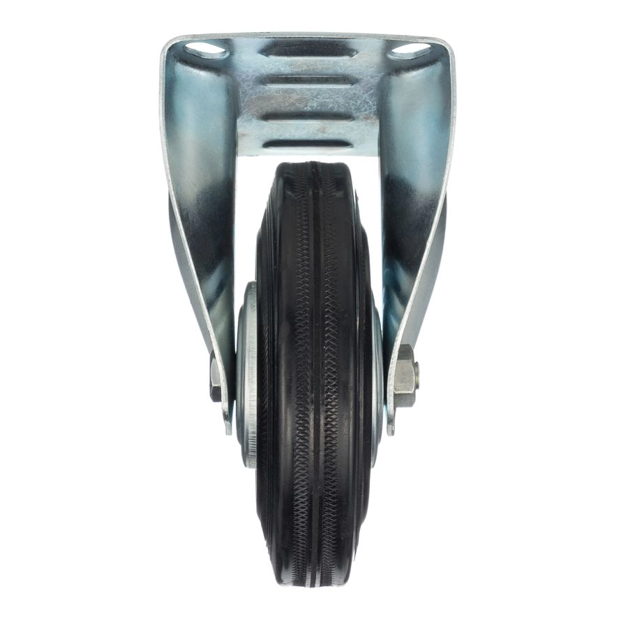 Колесо неповоротное 4002-120, диаметр 120мм., грузоподъемность 100кг. Колеса из черной литой резины, центр из двух гальванизированных дисков из штампованной стали. Роликовый (игольчатый) подшипник расположен в углублении, выдавленном под прессом, и содержит цилиндрические ролики подшипника. Неповоротный кронштейн изготовлен прессованием из листовой стали. Возможно применение на относительно грубых полах складов, заводов, производственных и строительных площадках. Данные колеса можно использовать на неровных поверхностях, во влажной окружающей среде и использовании вне помещения, не рекомендуется применять в среде с органическими растворителями, хлорированными веществами, гидрокарбонатами и минеральными маслами. Температура эксплуатации от -20 до +70С.
