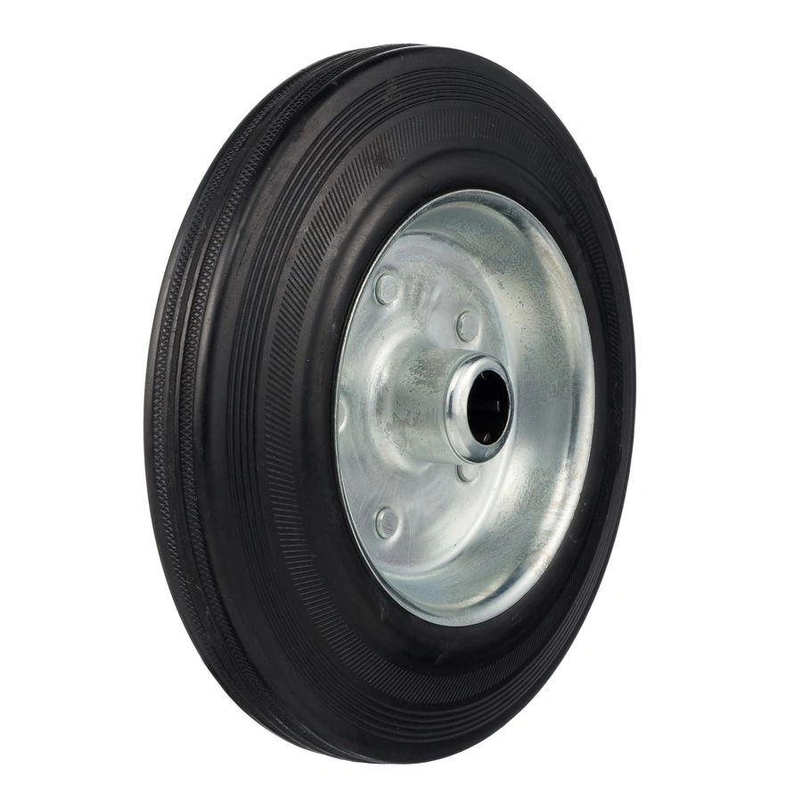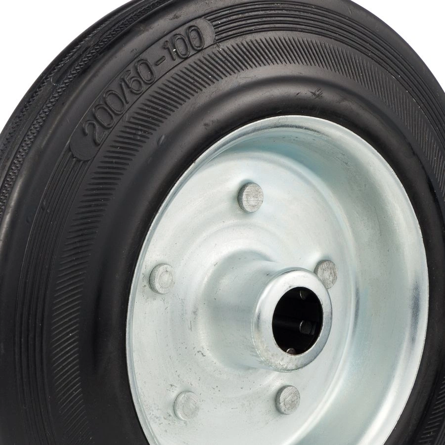Колесо под ось 20мм. 4000-200, диаметр 200мм., грузоподъемность 185кг., резина, металл. Колесо из черной литой резины. Центр из стального оцинкованного обода из штампованной стали. В оси колес роликовый подшипник. Колеса из черной резины, центр из двух гальванизированных дисков из штампованной стали. Роликовый (игольчатый) подшипник расположен в углублении, выдавленном под прессом, и содержит цилиндрические ролики подшипника. Возможно применение на относительно грубых полах складов, заводов, производственных и строительных площадках. Данные колеса можно использовать на неровных поверхностях, во влажной окружающей среде и использовании вне помещения, не рекомендуется применять в среде с органическими растворителями, хлорированными веществами, гидрокарбонатами и минеральными маслами. Температура эксплуатации от -20 до +70С.