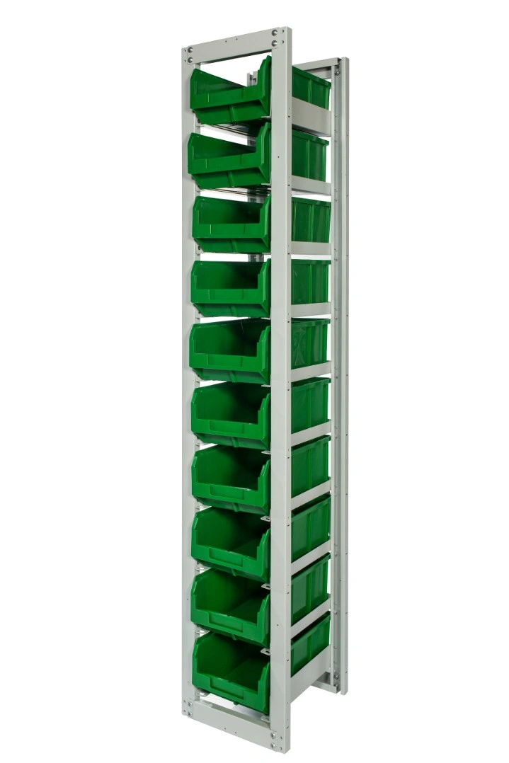 Данная модель стеллажа предназначена для средних размеров контейнеров модели V -3 и способна брать на себя достаточно большие нагрузки до 400 кг распределенной нагрузки на секцию. Стеллаж вмещает в себя 10 ящиков по высоте. Количество по ширине определяется количеством дополнительных наращиваемых секций.
