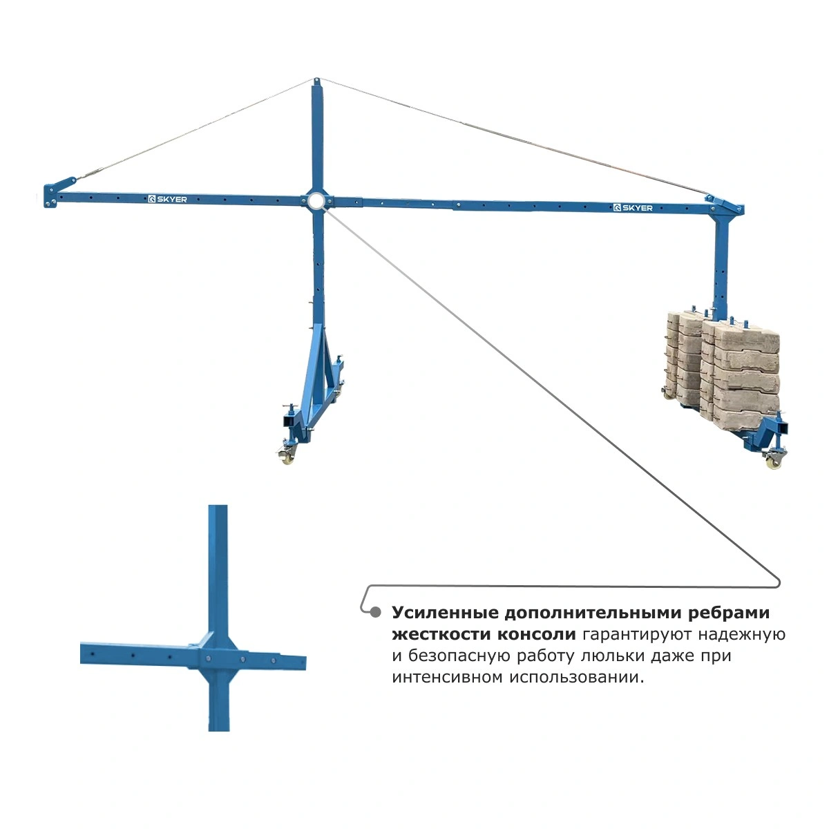 - Усиленные дополнительными ребрами жесткости консоли гарантируют надежную и безопасную работу люльки даже при интенсивном использовании.