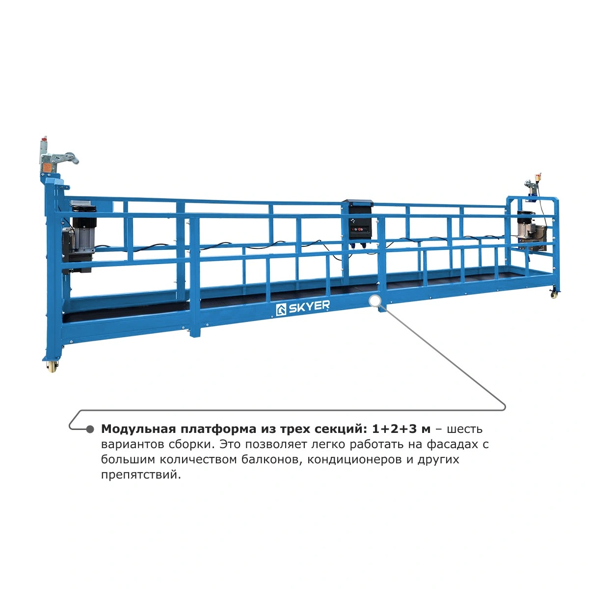 - Модульная платформа из трех секций: 1+2+3 м – шесть вариантов сборки. Это позволяет легко работать на фасадах с большим количеством балконов, кондиционеров и других препятствий.
