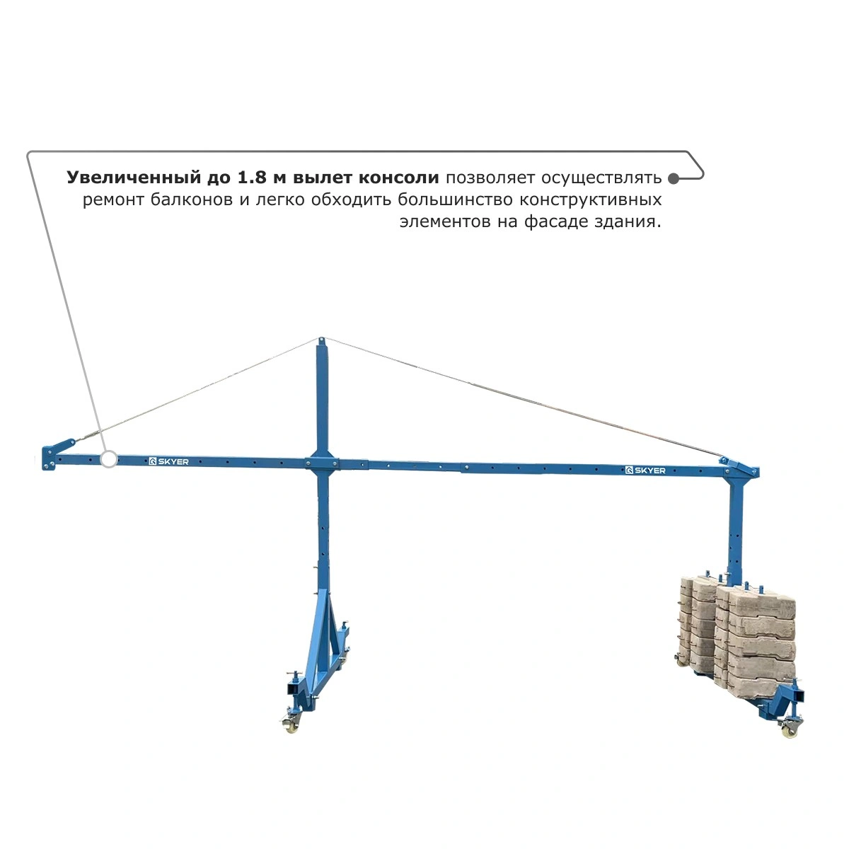 - Увеличенный до 1.8 м вылет консоли позволяет осуществлять ремонт балконов и легко обходить большинство конструктивных элементов на фасаде здания.
