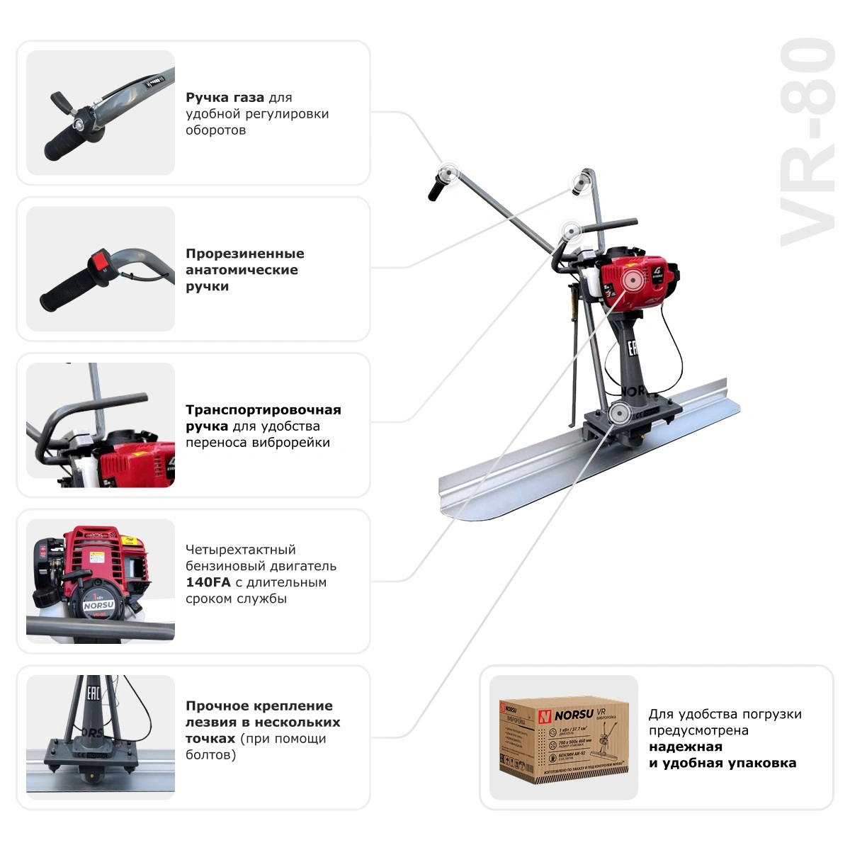 Виброрейка NORSU VR-80 — бензиновая модель, которая используется для равномерной укладки и уплотнения бетонных смесей. Техника удобна в эксплуатации, имеет небольшой вес (15.4 кг). На раме установлена опорная ножка, что позволяет обеспечить защиту элементов управления от загрязнений во время остановки. Виброрейка оборудована двигателем HUASHENG 140FA с объемом бака для топлива 0.65 л.