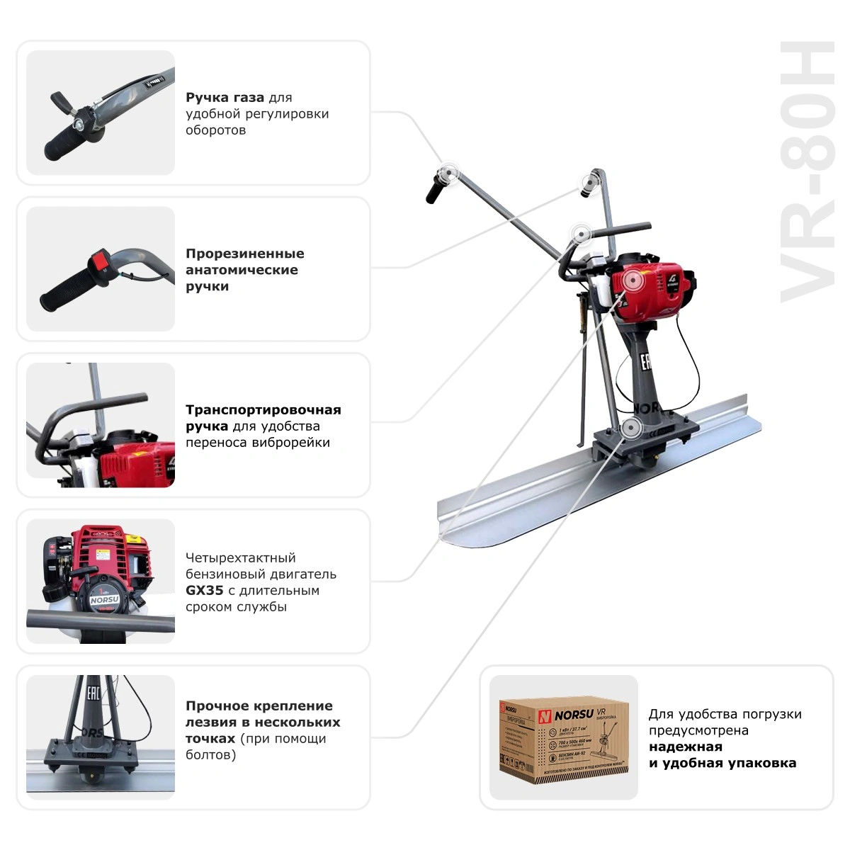 Виброрейка NORSU VR-80H — бензиновая модель, которая используется для равномерной укладки и уплотнения бетонных смесей. Техника удобна в эксплуатации, имеет небольшой вес (15.4 кг). На раме установлена опорная ножка, что позволяет обеспечить защиту элементов управления от загрязнений во время остановки. Виброрейка оборудована двигателем HONDA GX35 с объемом бака для топлива 0.63 л.