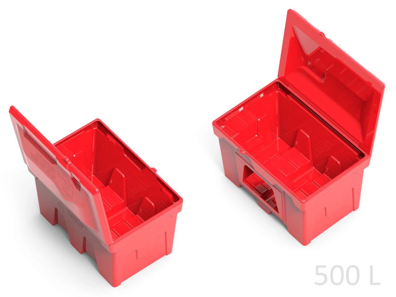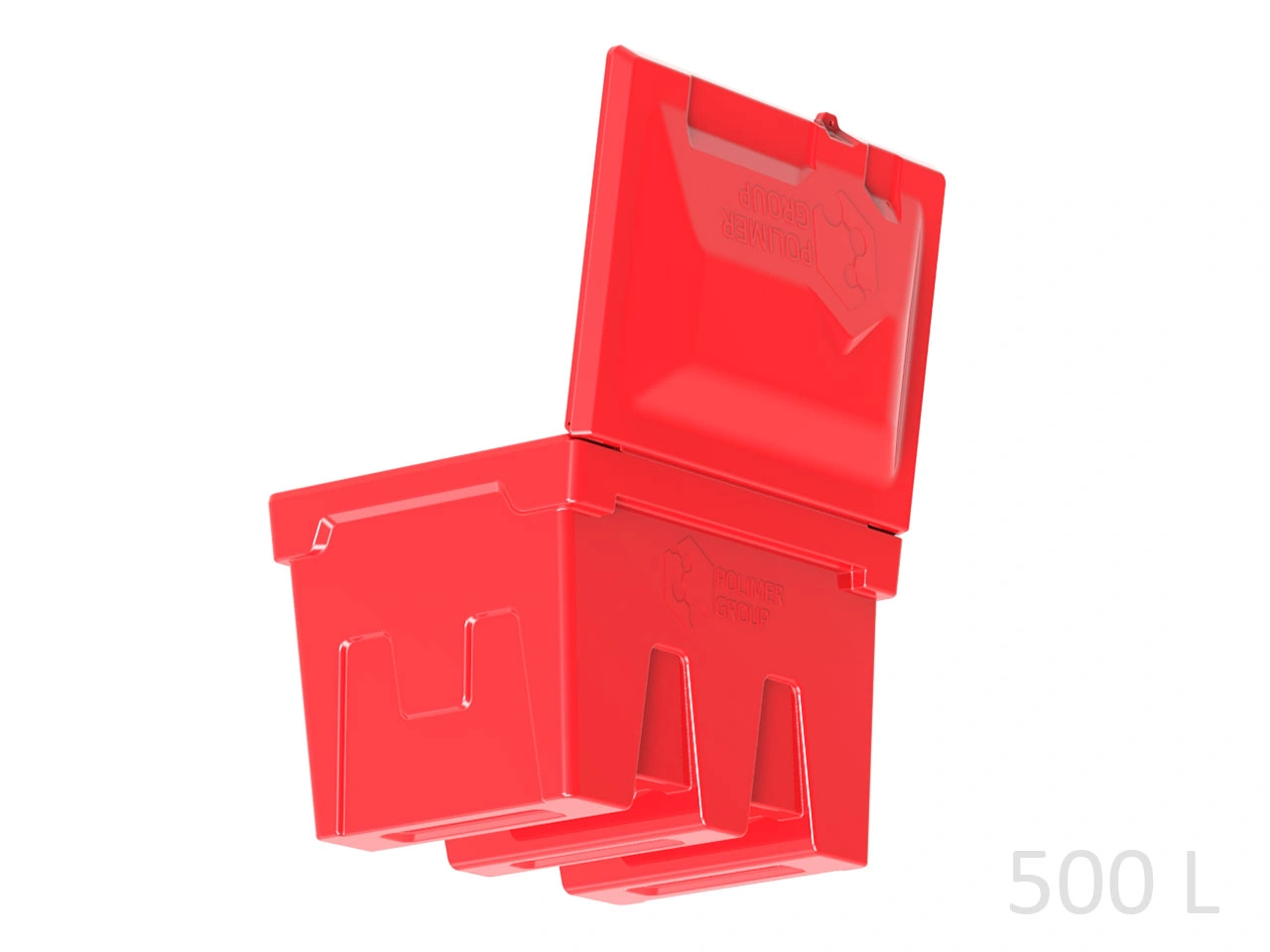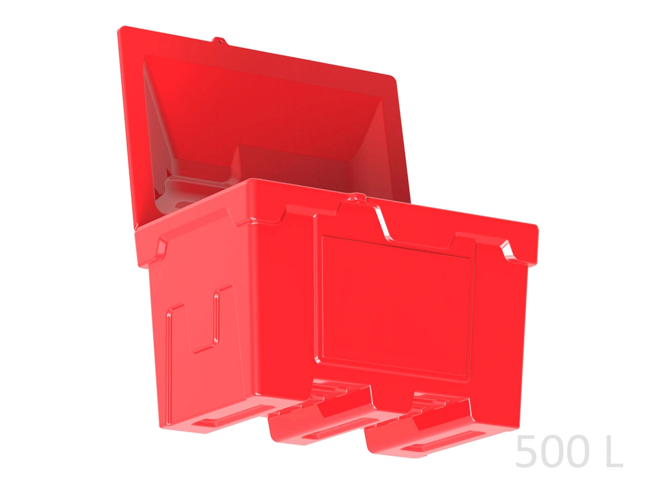 Объем контейнера для песка 500 л. Предназначен для хранения песка, применяемого для тушения пожаров на заправочных станциях. Изготовлен из полиэтилена методом ротоформования, что придает особую прочность.